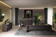 Livré avec un encadrement en Caisse américaine en aluminium noir et un système d'accrochage mural.